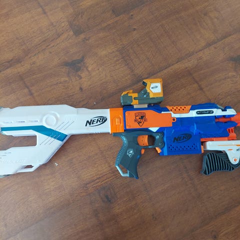 Käytetty, mutta hyväkuntoinen Nerf Elite ase. Sisäkäytössä ollut pelkästään.
