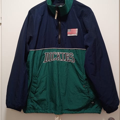 Tummansininen Dickies kuoritakki. Ohut vuori, sisäpuolella povitasku. Tuulen- ja sateenpitävä. Helmassa kiristysnyöri ja edessä nepparikiinnitys. Erittäin hyvässä kunnossa.