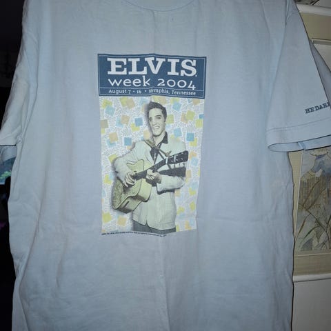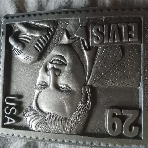 Myydään kuvien mukainen vintage Elvis Presley vyönsolki. Materiaali täyttä tinaa. Paino 91 grammaa.