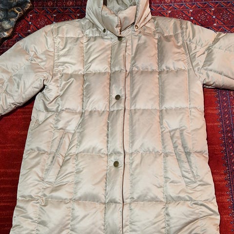 Snow Owl -merkkinen, pitkä (puoleen sääreen 165cm pitkää henkilöä) untuvatakki. Koko L, mutta pientä kokoa, ja vastaa ehkä enemmänkin M. Hupun karva (nappikiinnitys) vaikuttaa mielestäni aidolta turkikselta, mutta en osaa sanoa varmaksi.