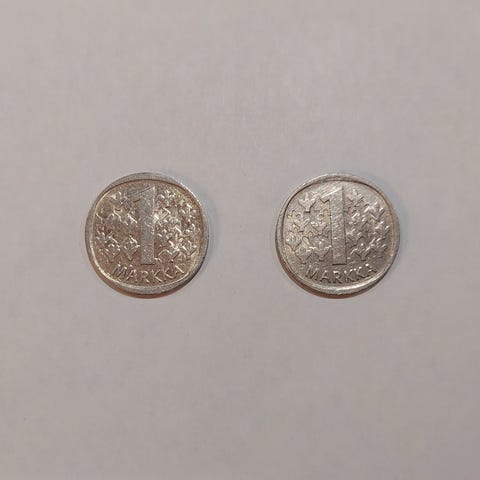 1 markan kolikko, 1989, metalliseos kuparinikkeliä (750 Cu, 250 Ni) 6,1 g, läpimitta 24 mm. Kolikon suunnittelija Heikki Häiväoja. Tarkistathan kunnon kuvista! Hinta 1 euro. Kiva ja halpa lahjaidea! Nouto kuluitta Helsingistä myyjän osoitteesta tai postitus kirjeenä 2,90. Katso mielellään myös muut myynnissä olevat kolikot ja tee löytöjä, useamman postitus myös halvempaa. Saat muut esille hakusanalla ollin kolikot.