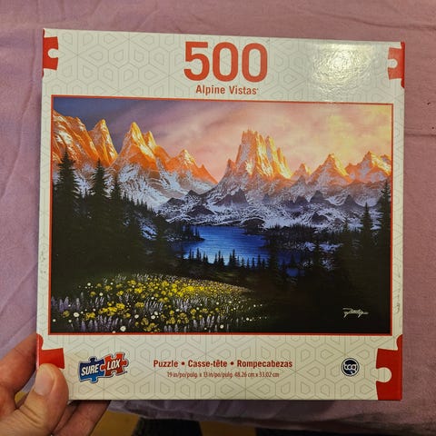 Hyväkuntoinen palapeli, purettuna omassa laatikossaan.