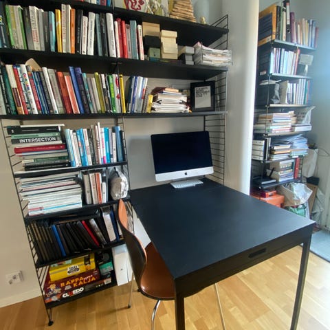 String Furnituren String-klaffipöytä on kätevä ja monikäyttöinen taittuva pöytä, joka kiinnitetään String System -sarjan lattiapaneeleihin. String System on kevytrakenteinen hyllyjärjestelmä, jonka arkkitehti Nils Strinning suunnitteli vuonna 1949.