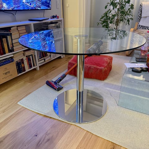 Lasilevyssä naarmuja ja kulumaa. Pöydän runko on hieman kiero ja lasilevy heilui, mutta tämä vika on korjattu tassulla.