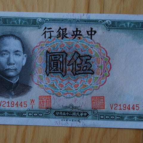 This 10 Yuan Chinese banknote was issued by The Central Bank of China in 1936. It measures 165 mm x 82 mm. Its obverse side features a portrait of Sun Yat-sen and the reverse side depicts the Palace of China in Peking.