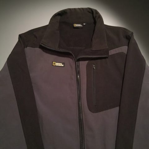 National Geographicin ohut tekninen takki. Normitaskujen lisäksi tasku vasemmassa hihassa.