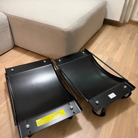 Pyörillä oleva vaunu helpottaa liikuttamista. Neljälle renkaalle, joiden enimmäisleveys on 225 mm. Huolellinen säilytys, joka estää muodonmuutoksia, kun renkaat lepäävät vanteillaan. Säästää tilaa autotallissa. Valmistettu alumiinista ja muovista.
