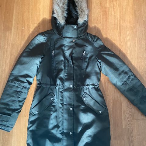 Hyväkuntoinen ja lämmin toppatakki karvahupulla.