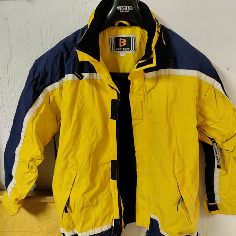 Kohtuu kunnossa oleva toppatakki. Soveltuu hyvin lasketteluun: irrotettava huppu, lumilukot hihoissa, kulutusta kestävää ja vettä hylkivää kangasta.