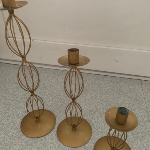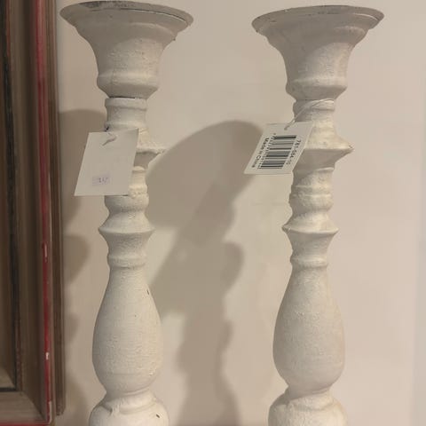 Kunto hyvä ja siisti, ei steariinijälkiä. Toisessa kynttilänjalassa alaosassa kaksi pientä jälkeä maalipinnassa, näkyvät viimeisessä kuvassa.