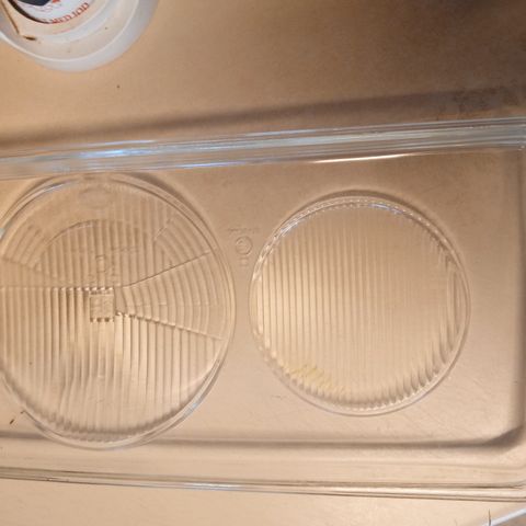 Raskaan museokaluston takavalon linssit. Nämä ovat keskenään samalla sopivuudella, jostain syystä näyttävät kuvassa erikokoisilta, mutta eivät sitä siis todellisuudessa ole. Eivät ole 100% pari, kun vasen on Made in Germany ja oikea Made in Austria, niin ovat käyttäneet vähän eri tekstuuria linsseissä. Mukaan lisäksi kaupan päälle kolmas kappale itävaltaversiota, jossa valitettavasti kuljetusvaurio reunassa. Osaavalta korjattavissa. Uusia ajalta kauan ennen kiinatuotantoa. Eivät ole koskaan olleet auringonvalossa.
