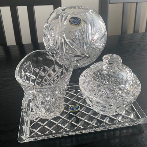 Uusia. Tsekkiläistä kristallia, korkeus 10cm. Näitä useampi laatikko Tuusulan Purolassa (Järvenpää). Mieluiten nouto. Maksu käteinen tai MobilePay. Ja 15€ on tuon laatikon jossa 6 kpl hinta.