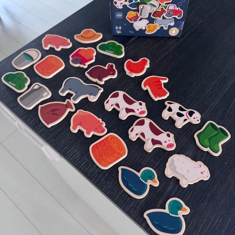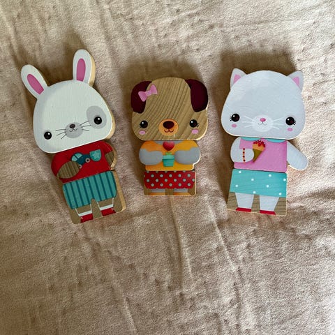 Puiset 20 cm korkeat Melissa&Doug hahmot, joille voi vaihtaa magneettivaatteita ja asusteita. Mukana laatikollinen vaihtovaatteita. Puinen säilytyslaatikko tulee mukaan. Ok käytetyssä kunnossa. Nouto ja MobilePay.