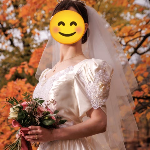 90 luvun morsiuspuku kokoa 36. Säilytetty omassa pussissa ,mukaan alushame ja huntu jota voi muotoilla mieleisekseen. Hameen helmiäiskoristelussa tummentumia. Hunnusta puuttuu helmiä. Hame ehjä.