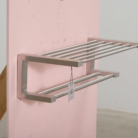 Ruostumattomasta teräksestä valmistettu tyylikäs ja minimalistinen pyyheteline kylpyhuoneeseen tai keittiöön.