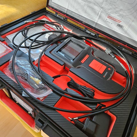 NÄYTÖLLINEN endoskooppi / kamera sisäänrakennetulla tukilangalla, LED apuvalolla, sekä aputyökaluilla
