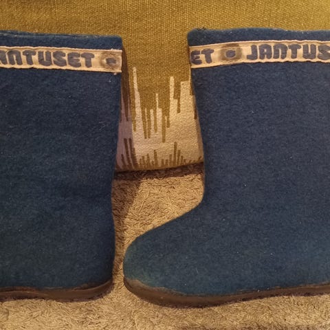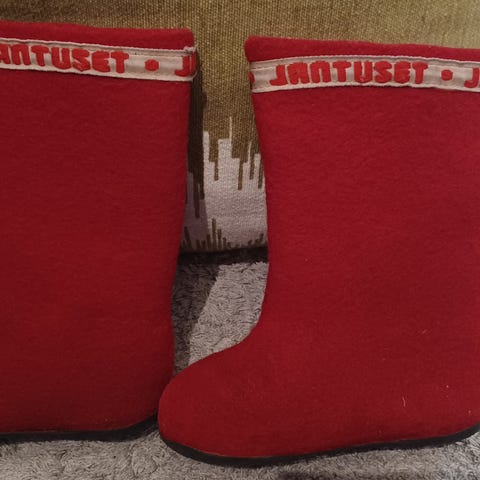 Pakkasiin lapselle lämpimät tossut kumipohjilla. Pohjan pituus n. 19,5 cm. Anna niminen nimikointi näkyy koristenauhassa. Voin postittaa postimaksua vastaan.
