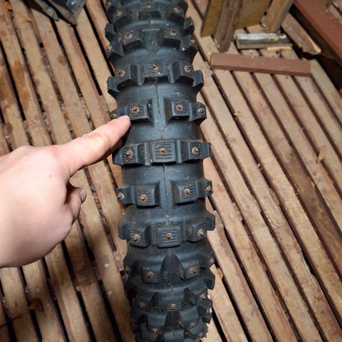 Käyttökelpoiset mopon nastarenkaat. 130/70-17 ja 100/80-17.