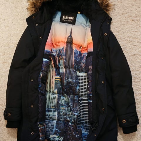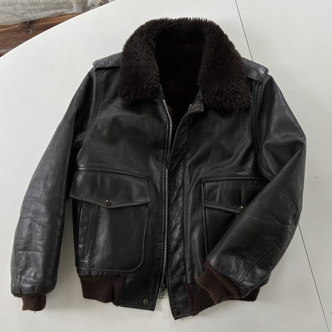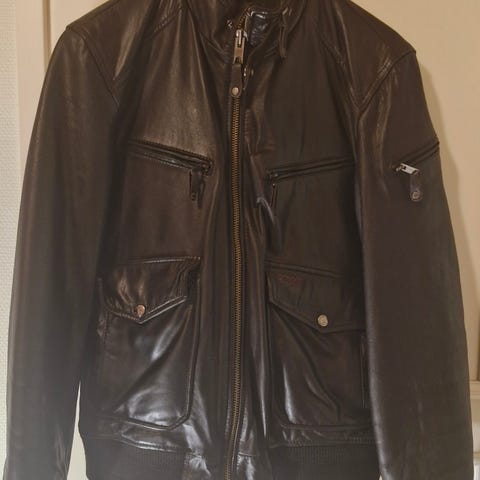 Noin vuonna 2005 ostettu, upeaa paksua ja kiiltävää kangasta. Lämmin toppavuori, sopii talvitakiksikin. Ajalle tyypillinen lyhyehkö malli, erittäin pukeva. Käytetty jonkun verran aikoinaan, vetoketjun musta maali kulunut, resoreissa nukkaantumista ja vuorin tekstilappu vähän kulahtanut, muuten ehjä ja hyväkuntoinen, kainalot siistit sisällä ja ulkona. Vetoketjuvetimet on aitoa nahkaa ja vetoketju metallia. Schott velcrotarralappu puuttuu rinnasta. Pesty 12/24 myyntiä varten. Hinta on tiukka eikä tule laskemaan. Käsittääkseni Schott ei enää valmista tätä näin kiiltävää ja muutenkin tämän ajan tuoteet on vielä paremmin tehtyjä, paremmista materiaaleista mitä nykyään ks kuvat.