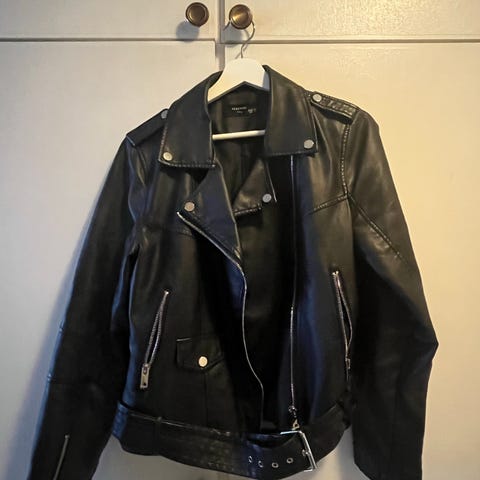 Musta biletakki jossa tekokarvaa. Kiinnitykseen hakanen ja nauhat edessä. Koko noin 36 jos haluaa lämmintä alle. Tekonahkaa.