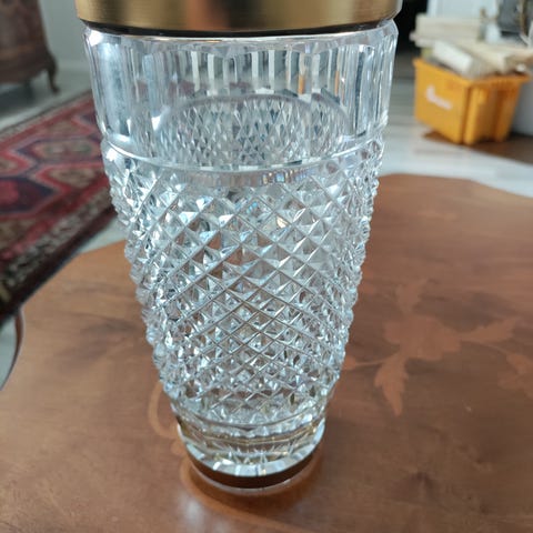 Kaksi samankuvioista kristallista maljakkoa. Isompi korkeus 15 cm ja pienempi 10,4 cm. Käyttämättömät, saatu palkinnoksi.