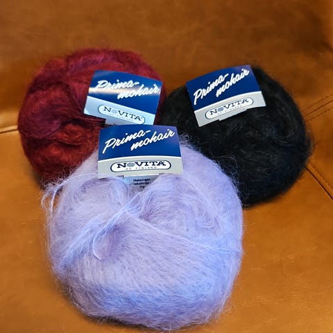 Vanha novita mohair lankoja. On viela musta 12 kappaletta ja punaista 4 kappaletta