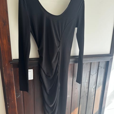 Hyvässä kunnossa musta + hopea vivahteita värinen mekko .Hihat 3/4.Taskut sivussa ja kaunis napit edessä.Kai -kai noin 0.45 cm.Pituus noin 90 cm.