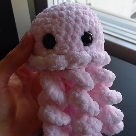 Puuvillalangasta virkattu mustekala. Pään halkaisija n. 5 cm, sisällä vanua. Ei irtoavia osia. Tulee kirjeenäkin Toridiilin ulkopuolella.