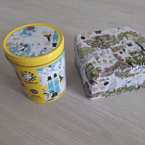 Sarja tyhjiä ja hyväkuntoisia peltirasioita, joissa myyty Fazerin muumikeksejä.