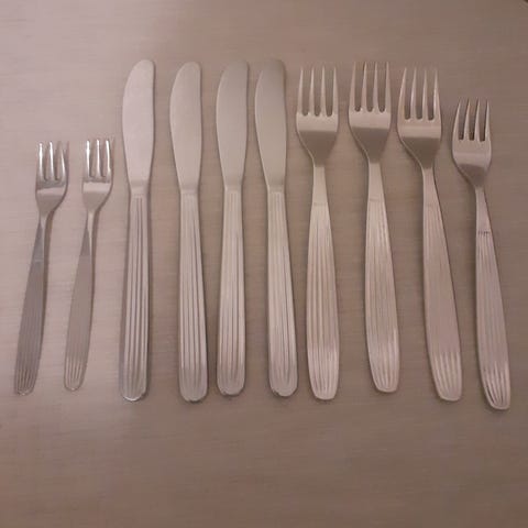 Alkuperäisiä, Vanhaa tuotantoa 1950-1960-luvulta. Terästä. Suunnittelija: Kaj Franck. Pientä käytön jälkeä löytyy.