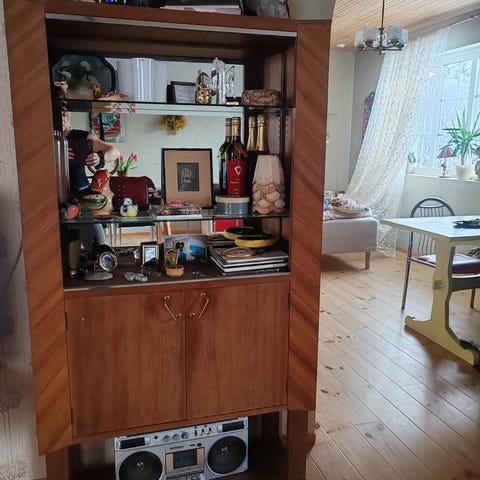Tiikkiviilun alla umpimänty, säädettävissä hyllykorkeus.