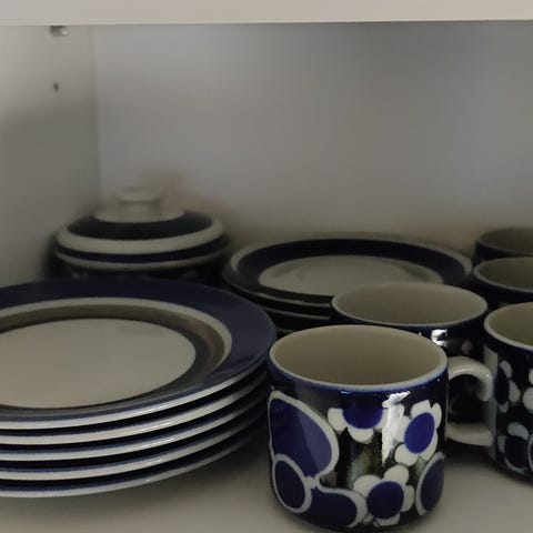 Anja Jaatinen-Winqvistin Arabialle suunnitteleman Saara-sarjan astioita. Myytävänä 2 teekuppia asettimineen ja leipälautasineen (halkaisija 20 cm) ja 4 kahvikuppia samoilla lautasilla. Astiasto on muuten vähän käytetty ja hyvässä kunnossa, mutta yhdessä kahvikupissa on pieni halkeama reunassa (kts. viimeinen kuva).