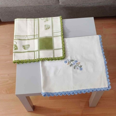 Kolme kivaa pientä kesäaiheista liinaa, vaalea pohja kuviossa kesäkukkia, mustikoita ja mansikoita. Koko n. 24x25 cm. Käytetyt mutta siistit.