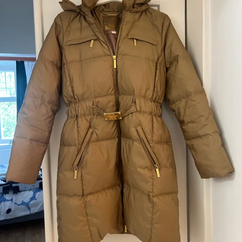 Todella kaunis ja lämmin Michael Korsin talvitakki. Musta, kullanväriset vetoketjut ja yksityiskohdat. Uudenveroinen kunto, vain muutamia kertoja käytetty. Muhkea karvahuppu, irrotettava huppu.