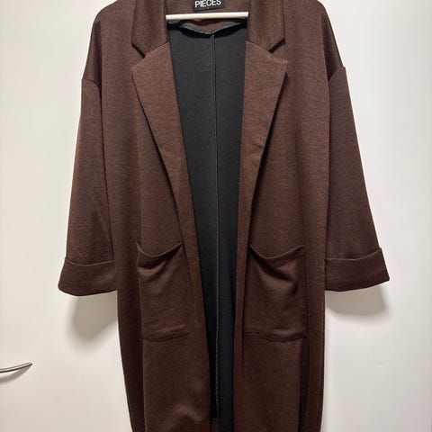 Uutta vastaava(kerran käytetty) tumman ruskea takki. Lähikuvassa vääristyy väri vaaleammaksi. Koko 36. Kai-kai 56 cm ja olka-helma 105 cm.