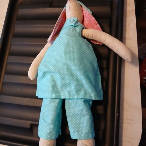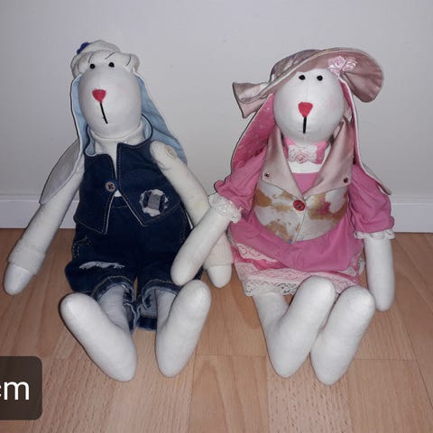 Hello everyone! I'm selling a handmade textile toy. White Tilda bunny in a dress - size 48 cm, price €25. Beige boy in overalls - size 50 cm, price €25. The toys are handmade using fleece fabric, filled with hollofayber, and can be hand-washed at 30 degrees. All toys are made with love and make a great gift. Message me, and I can send them via Tori delivery.