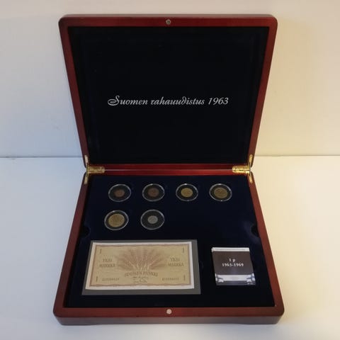Aidot rahat ennen ja jälkeen rahauudistuksen 1963 hienossa puulaatikossa. Rahat koteloissa. Aitoustodistukset.