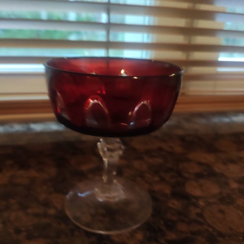 Ravenhead Siesta jälkiruokasetti 1960 -luvulta. Kulhon leveys leveimmillään 22cm ja korkeus 8 cm, tarjoiluastiat leveys leveys 12,5 cm ja korkeus 4,5 cm