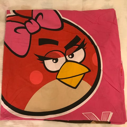 Myydään Angry Birds pussilakana + tyynyliina. Pussilakanan koko 150x210cm ja tyynyliinan 50x60cm. Kunto muuten hyvä, mutta pussilakanassa on kolme pientä reikää/reiän alkua (näkyy kuvassa 5).