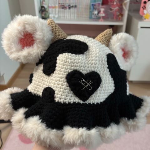 Kerran käytössä ollut lehmäasu. Käytössä ollut 175 cm pituisella, sopii hieman pidemmälle ja lyhyemmällekin. Tarrakiinnitys selässä. Pientä kellerrystä jalassa ja haaroista hieman nukkaantunut.