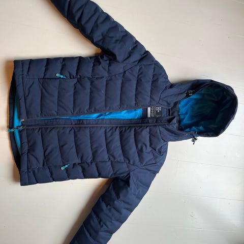 Sininen hyväkuntoinen takki tytöille. Vyö on valitettavasti kadonnut.
