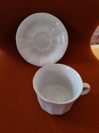 Valkoinen kahvikuppi ja lautanen. Setti sisältää 16 kpl kahvikuppeja ja lautasia, valmistettu kestävästä posliinista. Sopii kahvin tarjoiluun ja juhlakattauksiin. Kupit ja lautaset ovat ajattomia ja tyylikkäitä, mikä tekee niistä monikäyttöisiä ja helppoja yhdistää muihin astioihin. Kupin halkaisija 7,5 cm, Lautanen 13 cm