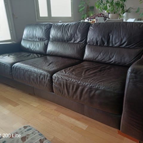 Ostetaan kuvan mukainen ruskea nahkasohva. Divaani, kulmasohva tai avokulmasohva.