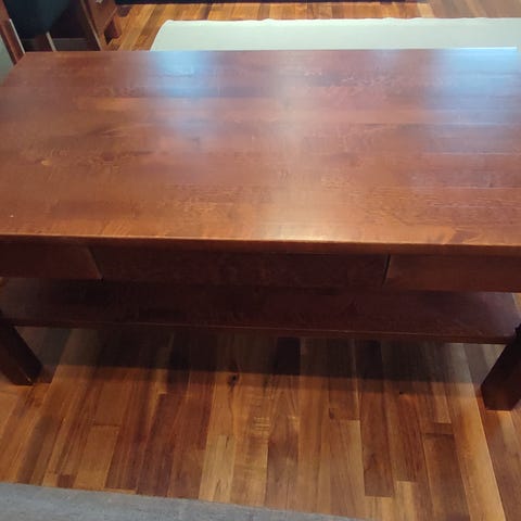 Pyökin värinen massiivikoivuinen ja painava sekä tukeva sohvapöytä laatikolla ja välihyllyllä, hyväkuntoinen. Nyt säilytyksessä varastossa. Tarjouksia kuunnellaan.