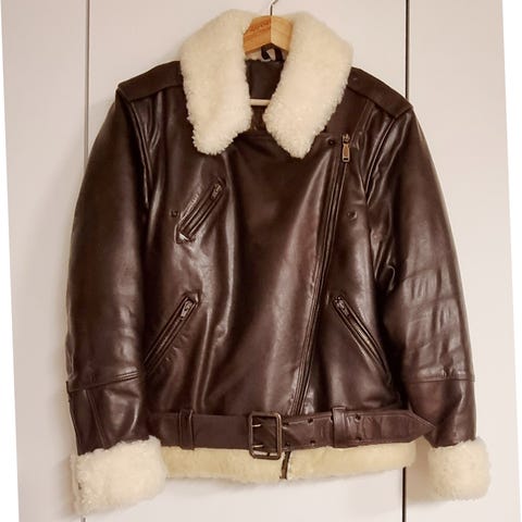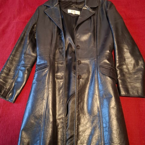 Musta pitkä nahkatakki, "Kultaiset" napit ja reunus.