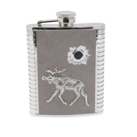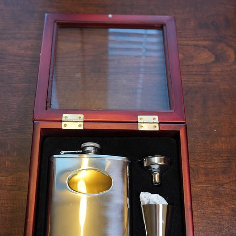 Setti, jossa hieno nahkapäällysteinen ruudullinen taskumatti, kolmen kupin sarja sekä tratti. Pakattu upeaan puulaatikkoon. Taskumatissa patentoitu D-Pro suojaus, joka suojaa sisäpinnan korroosiolta.