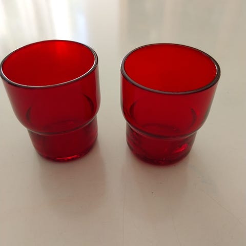Saara Hopean suunnittelemat painottavat snapsilasit. Kunto oikein hyvä. Ei mielestäni käytön jälkiä. Korkeus noin 4,5cm ja halkaisija 3,8cm. Yhteishinta 35€ ja mahdollinen toimitus 8€.