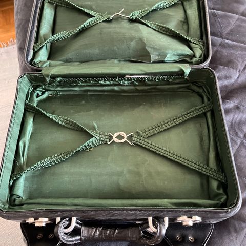 Ruskea oletettavasti tekonahkainen matkalaukku, sisäpuoli mustaa kangasta. Lukkojen avaimet hävöksissä. Muutamaa pintakolhua lukuunottamatta hyvin siistissä kunnossa. Korkeus 40cm, pituus 58cm, syvyys 17-18cm. Kiva vaikka vaan koristeenakin!