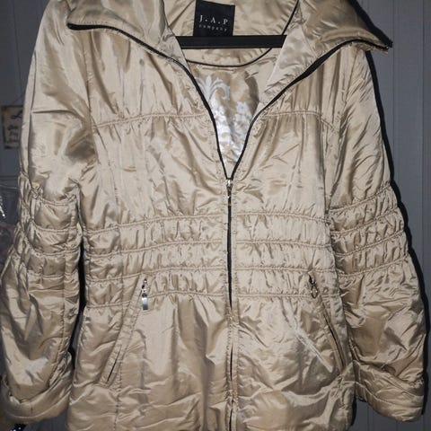 Edessä vetoketju ja nappilista, yläosassa kaksi vetoketjullista ja kaksi napillista taskua, hihoissa resorit. Sisäpuolella vyötärön kiristysmahdollisuus. Päällykangas liukasta materiaalia (100% polyesteria), vuori 100% polyesteria, täyte 100% polyesteria.