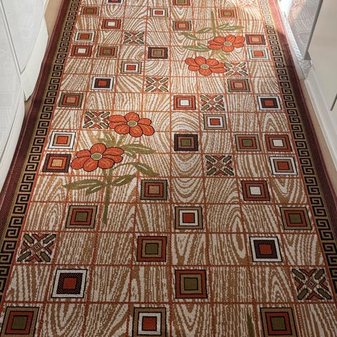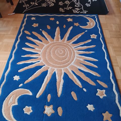 Ethän tingi kiitos. Kaunis matto räsymatto muistaakseni Eija Rasinmäki mutta lappua ei tallella enää. Meille uutena ostettu Kodin 1 firmasta. 120x190 kokoinrn. Pari pikku läikkää voi vaikka täsmäpuhdistaa. En koko mattoa pesisi.